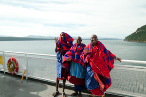We arrived just a little early, allowing some time to walk around the ferry terminal. As usual, the Maasai were quite the attraction as they walked around to different cars, greeting people and telling them of their upcoming performances in Victoria. Maliaki was already in networking mode as we met a couple who work in Rwanda and another who lives in Uganda. Truly a international melting pot just on one ferry.